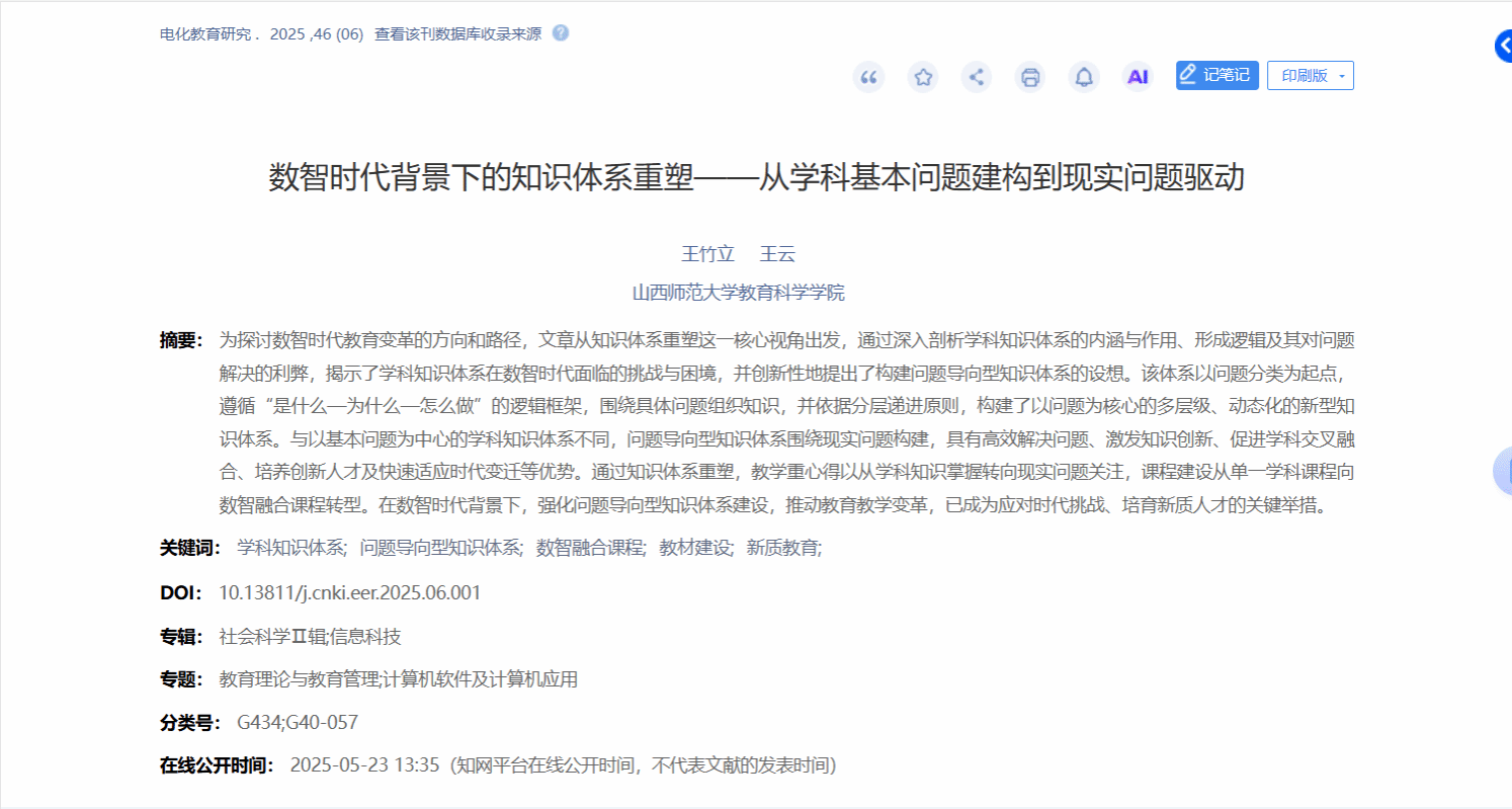 近日,伟德官网特聘教授王竹立在《电化教育研究》2025年第6期发表题为《数智时代背景下的知识体系重塑——从学科基本问题建构到现实问题驱动》的学术论文。
