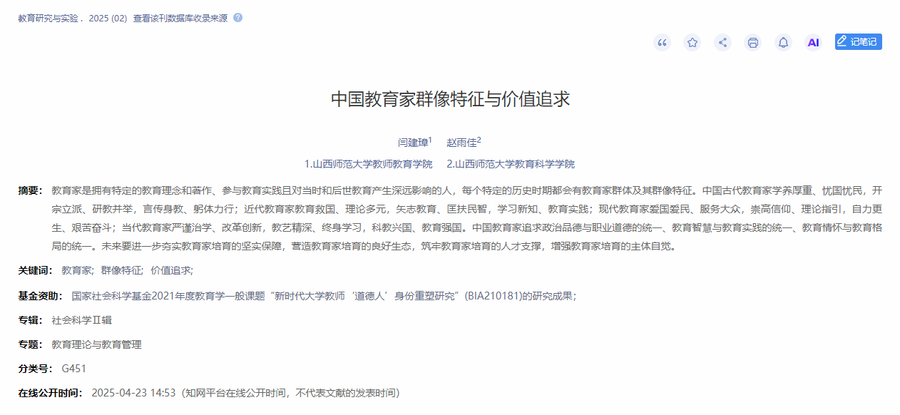 近日,伟德官网闫建璋教授在《教育研究与实验》2025年第2期发表题为《中国教育家群像特征与价值追求》的学术论文。
