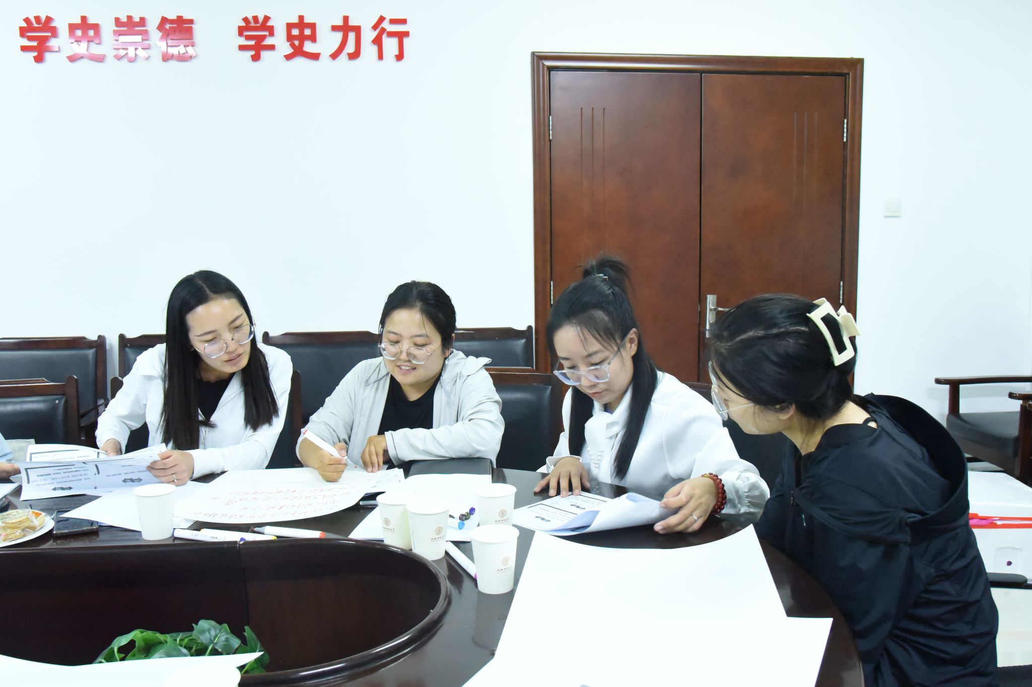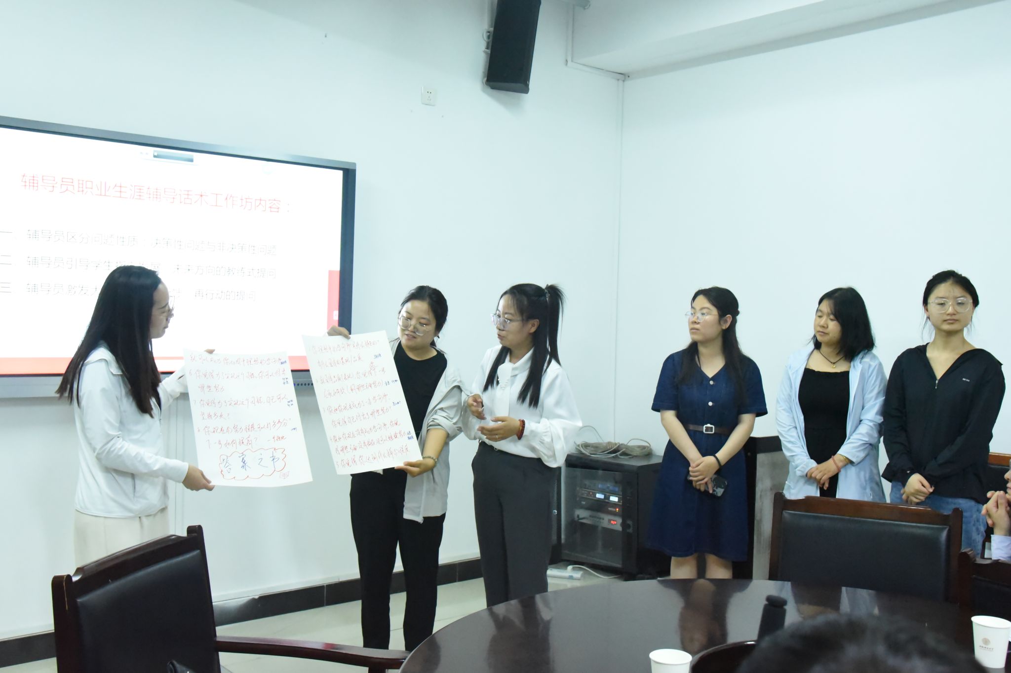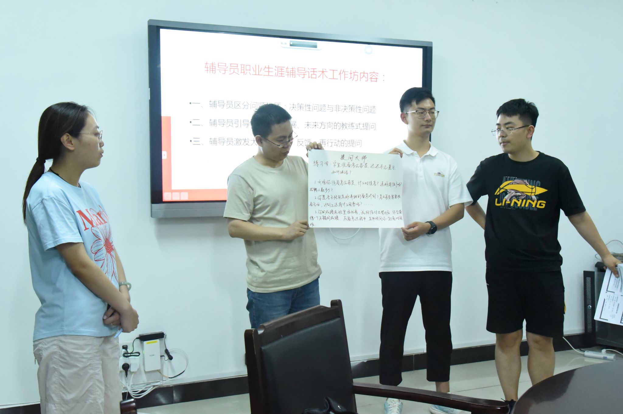 辅导员们分成三组就“我不喜欢这个专业,我不知道该何去何从”“我想成为一名咨询师,我该怎么做”“想考公务员,但迟迟不见复习”等问题,利用刚学到的“提问技术”展开了热烈的讨论,相互合作在画布上联合创作。在成果展示环节中,各组分享了问题设计、问题内容、可能产生的效果。现场气氛愉快、融洽而热烈。