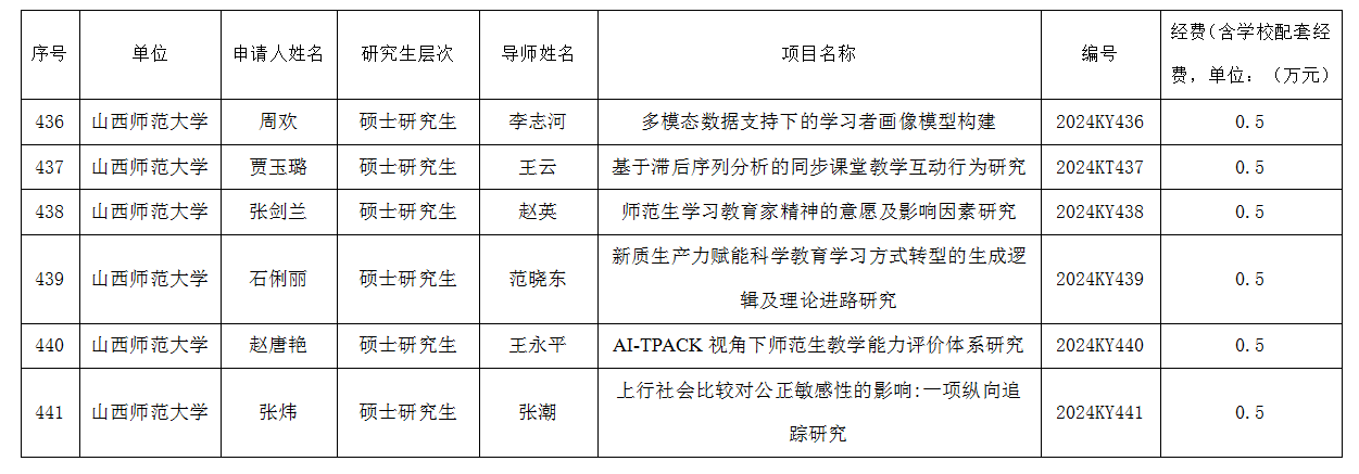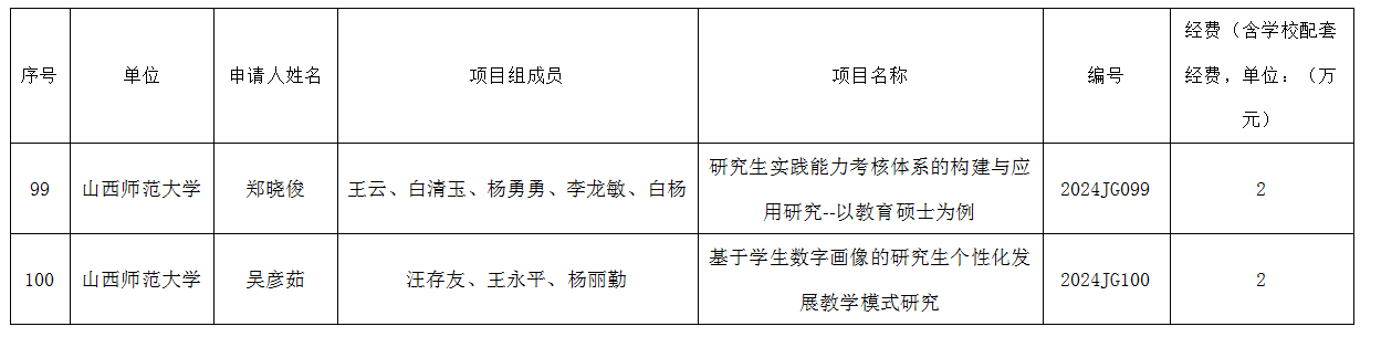 根据《山西省教育厅关于组织申报2024年度研究生教育创新计划各类项目的通知》(晋教研函〔2024〕2号)等文件精神,经师生积极申报、省教育厅组织评审公示,最终确定2024年度研究生教育创新计划各类项目。伟德官网获批研究生教育教学改革课题2项、研究生科研创新项目6项、研究生实践创新项目2项。