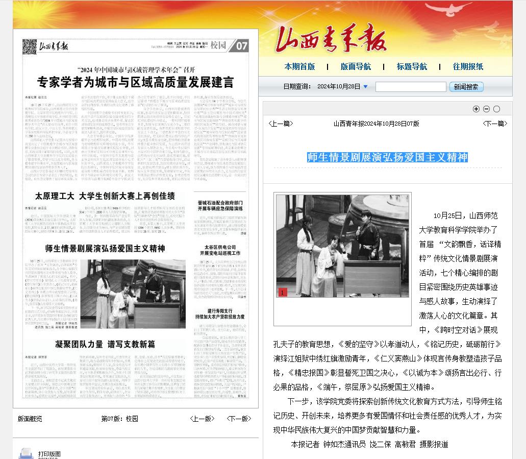 《山西青年报》10月28日第7版报道了伟德官网“文韵飘香,话译精粹”传统文化情景剧展演活动。