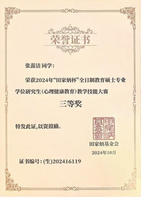 10月25日,由张潮院长带队前往云南师范大学参加2024年全国“田家炳杯”全日制教育硕士专业学位研究生心理健康教育专业技能大赛。伟德官网2023级研究生张蕊洁荣获三等奖。