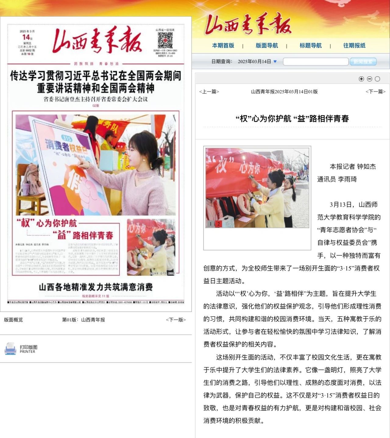 《山西青年报》3月14日第1版报道了伟德官网“‘权’心为你,‘益路相伴’”消费者权益日主题宣传活动。