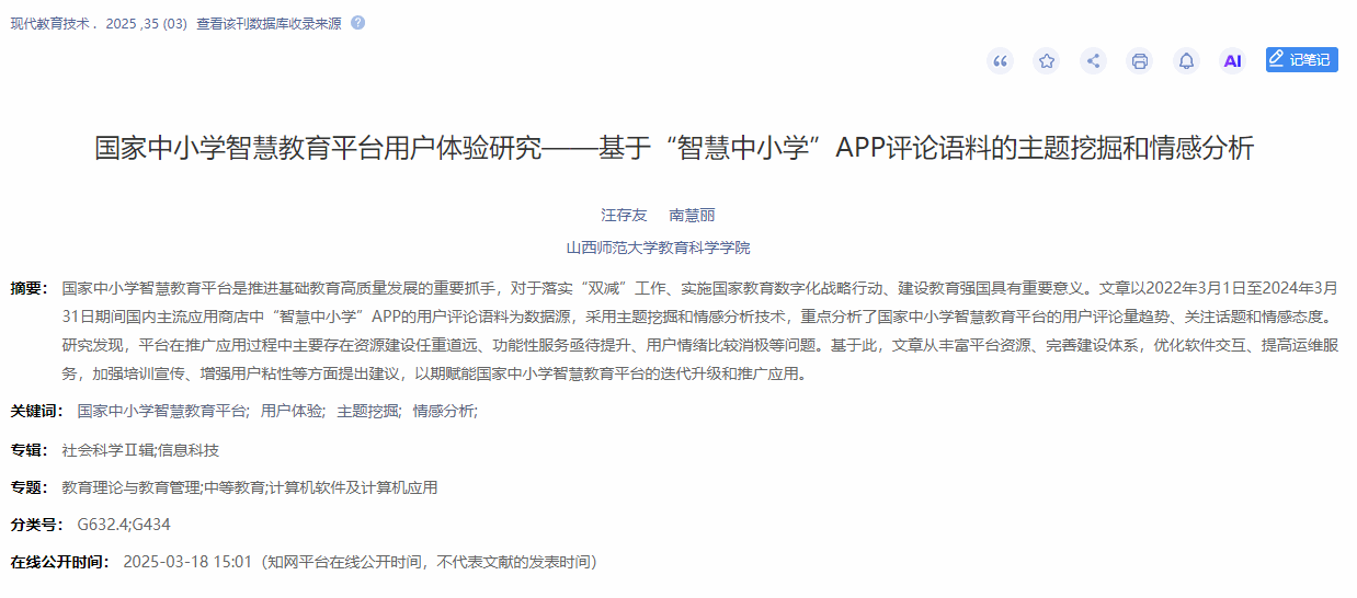 近日,伟德官网汪存友教授在《现代教育技术》2025年第3期发表题为《国家中小学智慧教育平台用户体验研究——基于“智慧中小学”APP评论语料的主题挖掘和情感分析》的学术论文。