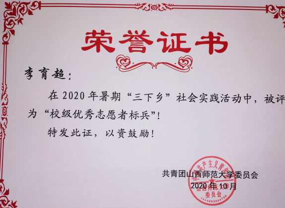 2020年暑期三下乡校级优秀志愿者标兵